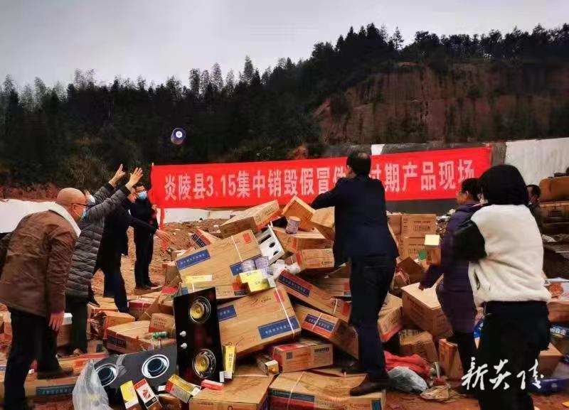 二是集中销毁假冒伪劣商品。活动期间,为充分展示市场监管成果,县市场监督管理局将罚没的4车假冒伪劣产品拖运至县城垃圾填埋场,进行现场填埋销毁。本次销毁的假冒伪劣商品包括过期食品、白酒、饮水机、燃气灶具、一次防护口罩等等,共计3000多件、16吨,货值300余万元。