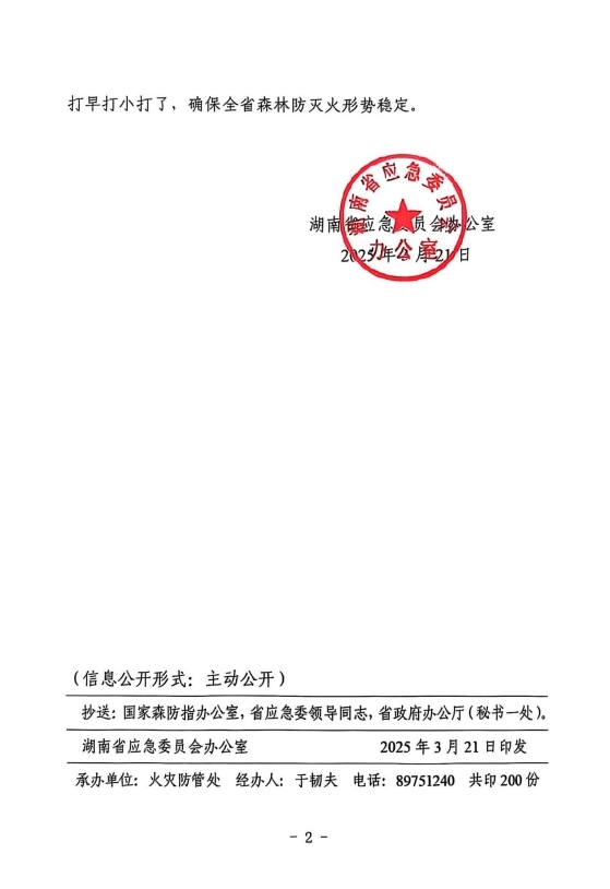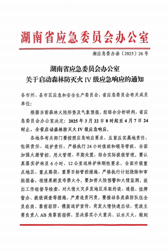 湖南省应急委员会办公室关于启动森林防灭火IV级应急响应的通知