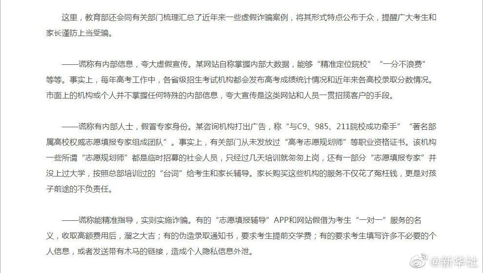 教育部郑重提醒广大考生和家长,目前没有任何招生考试机构、高校与社会机构或个人开展高考志愿填报指导的合作,切勿轻信所谓的“天价志愿填报”指导服务。