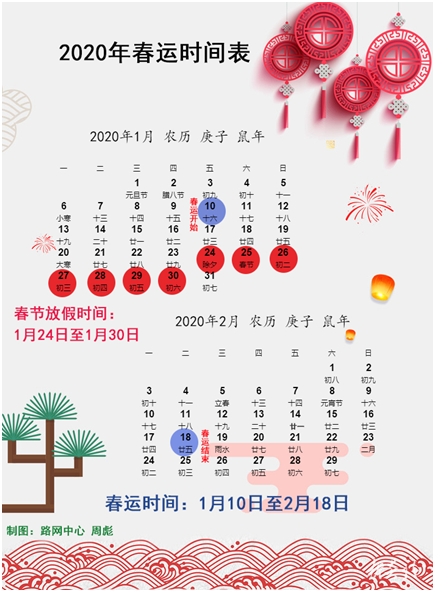 2020年铁路春运自1月10日开始,2月18日结束,共40天。1月8日,记者从2020年全省高速公路春运电视电话会议获悉,2020年春运较去年提前11天,今年春节是近八年里最早的农历新年。预计春运客流高峰比往年来得更早,节前学生流、务工返乡流、货运储备流相互叠加,客流呈阶段性变化,潮汐特征明显。