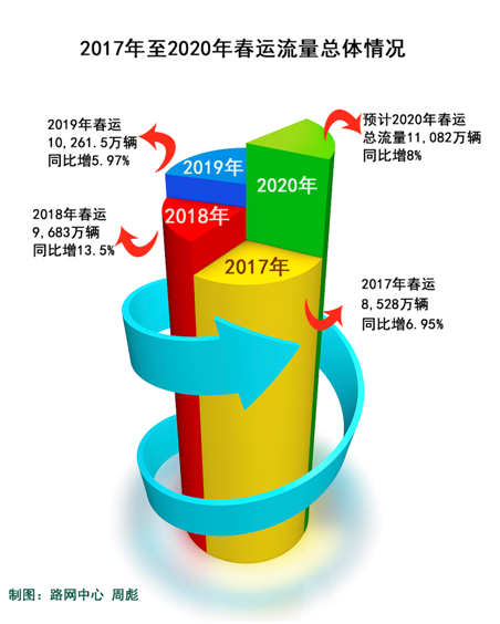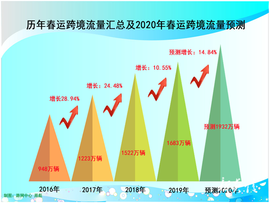 基于湖南省高速公路综合管理平台大数据分析,根据历年跨境流辆增长比校对,预计2020年春运跨境总流量约1,932万辆,较去年增长约14.8%,春节期间跨境总流量366万辆,较去年增长约13.3%。2020年春运是取消省界收费站后的第一个春运,车辆在省界处不再需要停车取卡,可以直接通行,进出湖南更加快捷、畅通,让湖南内外通行速度、通行效率得到最大程度提升。