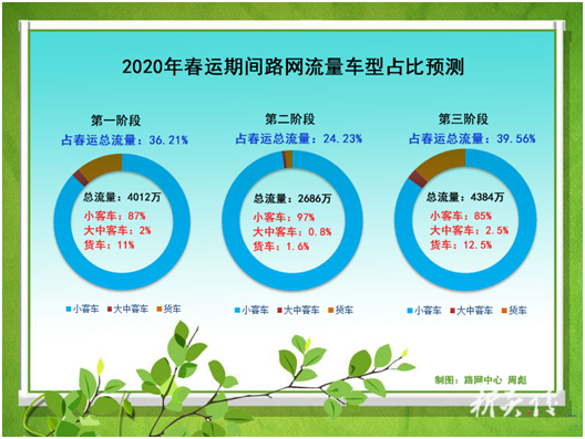 根据历年春运期间数据分析,2020年春运车型占比呈现有规律的阶段性变化,第一阶段春节前期(1月10日~1月23日14天),预测小客车占比87%,大中客车占比2%,货车占比11%;第二阶段春节假期(1月24日~1月30日7天)小客车明显增多,货车主动避峰,预测小客车占比达97.6%,大中客车占比0.8%,货车占比约为1.6%;第三阶段春运后期(1月31日~2月18日19天)恢复客货车、大小车混合交通模式,预测小客车占比85%,大中客车占比2.5%,货车占比12.5%。