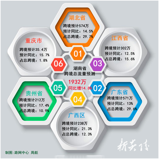 湘鄂间共有7个开通的省界通道,位于湖南北部,是与湖南交界省界通道最多的省份。2019年春运期间(40天),往返湘鄂的车辆总数为501.2万辆,占春运跨境车辆总数的29.92%。预计2020年春运期间往返湘鄂的车辆总数约为574万辆,同比增长约14.5%,约占春运跨境车辆总数的29.7%。湘鄂间日均流量为14.3万辆左右,湘鄂跨境峰值可能出现在正月初六。