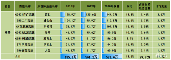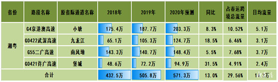 流量分析:湘粤间共有4个开通的省界通道,位于湖南南部,2019年春运期间(40天),往返湘粤的车辆总数为505.8万辆,占春运跨境车辆总数的30.1%。预计2020年春运期间往返湘粤的车辆总数约为571.3万辆,较去年增长13%,约占春运跨境车辆总数的29.6%。预计湘粤间日均流量为14.3万辆左右,湘粤过境峰值出现在正月初五和初六。