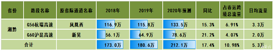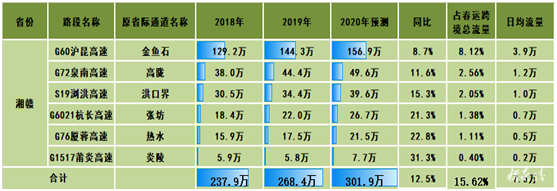 流量分析:湘赣间共有6个开通的省界通道,位于湖南的东部。2019年春运期间(40天),往返湘赣的车辆总数为268.4万辆,占春运跨境车辆总数的16.02%。预计2020年春运期间往返湘赣的车辆总数约为302万辆,较去年增长12.5%,约占春运跨境车辆总数的15.6%。其中湘赣间日均流量为7.5万辆左右,湘赣跨境峰值流量可能出现在正月初五和初六。