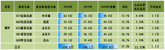 流量分析:湘桂间共有5个开通的省界通道,位于湖南西南方向。2019年春运期间(40天),往返湘桂的车辆总数为196.1万辆,占春运跨境车辆总数的11.71%。预计2020年春运期间往返湘桂的车辆总数约为237.8万辆,较去年增长21.3%,约占春运跨境车辆总数的12.31%。日均流量为5.9万辆左右,湘桂跨境峰值可能出现在正月初五和初六。