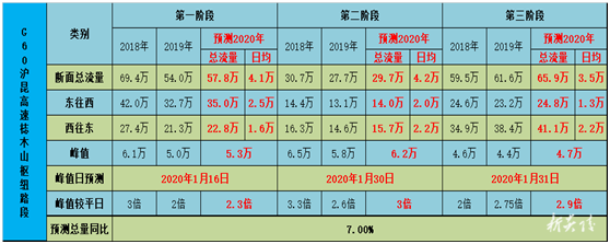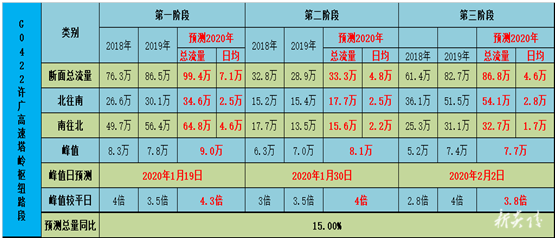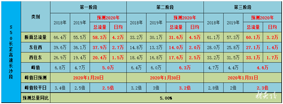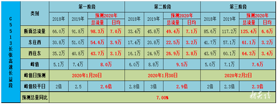 流量预测:根据往年春运期间长益高速公路的流量数据综合分析,预测2020年春运期间,长益高速公路(长沙西)断面总流量为273万辆左右,同比增长7%,断面日均流量达6.8万辆。预测春运期间该路段三个峰值时间段分别为1月20日(小年后)、1月30日(正月初六)、2月2日(节后返程)。