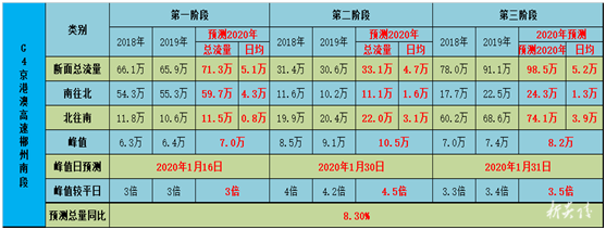 春运流量预测:根据往年春运期间G4京港澳高速郴州南段流量数据综合分析,预测2020年春运期间,郴州南段断面总流量为203.3万辆左右,同比增长8%,断面日均流量5.1万辆,且节前南往北流量占比达83.7%,北往南占比仅为16.3%,节后北往南流量占比达75.2%,南往北仅占24.8%,呈现明显的潮汐分布特征。撤销省际收费站后,通行效率将会得到提高,流量较往年也会有所增幅。