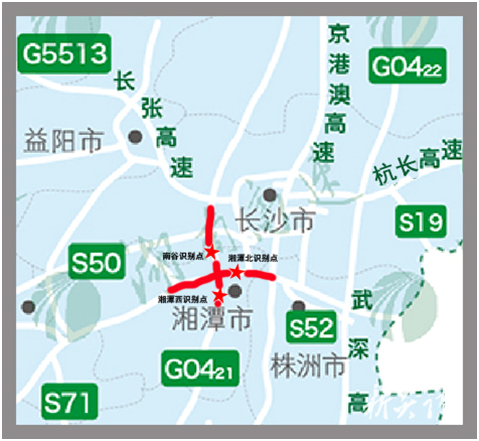 全省重点监测的40个收费站:G4京港澳高速临长段广福、星沙、平江西、岳阳收费站,长潭段雨花、李家塘、昭山、马家河收费站,潭耒段株洲西收费站,耒宜段郴州收费站;G5513长张高速长益段长沙西、朝阳收费站;G60沪昆高速潭邵段邵阳南、周旺铺、邵东收费站;G6021杭长高速长永段长沙、三一、黄花、永安收费站;G0401长沙绕城高速松雅湖、长龙、干杉、鹿芝岭、黄花塘、坪塘、大托、洞井、万家丽南、捞刀河、新港、星城、金桥、万家丽北收费站;G0421许广高速潭衡段杨嘉桥收费站,桂武段舂陵江收费站;S50长芷高速岳麓收费站;S21长株高速榔梨东收费站;S01韶山高速韶山站;S41长潭西高速学士收费站;机场高速长沙东站。