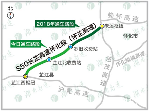 2019年11月13日S50长芷高速怀化段的怀(化)芷(江)高速全线通车,湖南再添一条贯通东西方向的重要运输通道。怀芷高速公路连接怀化市鹤城区西北部至芷江,起于鹤城区盈口乡朱溪村枢纽互通,止于芷江西枢纽互通。主线全长33.208公里,有4座互通、21座桥梁、2座隧道。路基宽度24米,采用4车道高速公路标准建设,设计速度为每小时100公里。全线开通后,将进一步优化怀化地区交通结构,对推进大湘西地区发展,为怀化市“五省边区生态中心城市”建设起到重要促进作用。贵州方向的车辆沿着怀芷高速前往吉首、重庆,要比走G60沪昆高速转G65包茂高速节约20公里左右。
