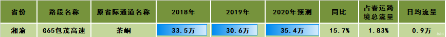 流量分析:湘渝间仅有1个省界通道,位于湖南西北方向,2019年春运期间(40天),往返湘渝的车辆总数为30.6万辆,占春运跨省车辆总数的1.83%。预计2020年春运期间往返湘渝的车辆总数约为35.4万辆,较去年增长15.7%,约占春运跨省车辆总数的1.83%。日均流量为1万辆左右,峰值流量为3万辆左右,峰值可能出现在正月初五和初六。