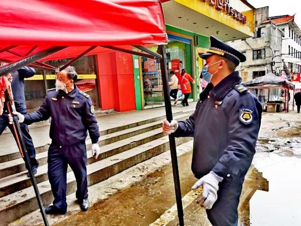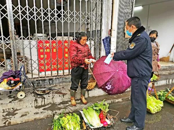 他是一名党员,是炎陵中队的中队长。年前,他已经连续在边贸市场、步行街等年货疏导区进行秩序管理工作20多天了。接到疫情防控通知,他立即奔赴一线,带队对辖区内农贸市场环境秩序进行管理维护,督促菜农和商户带好口罩做好防护措施,耐心劝散聚集采买的市民群众,对市场周边环境进行集中清理。
