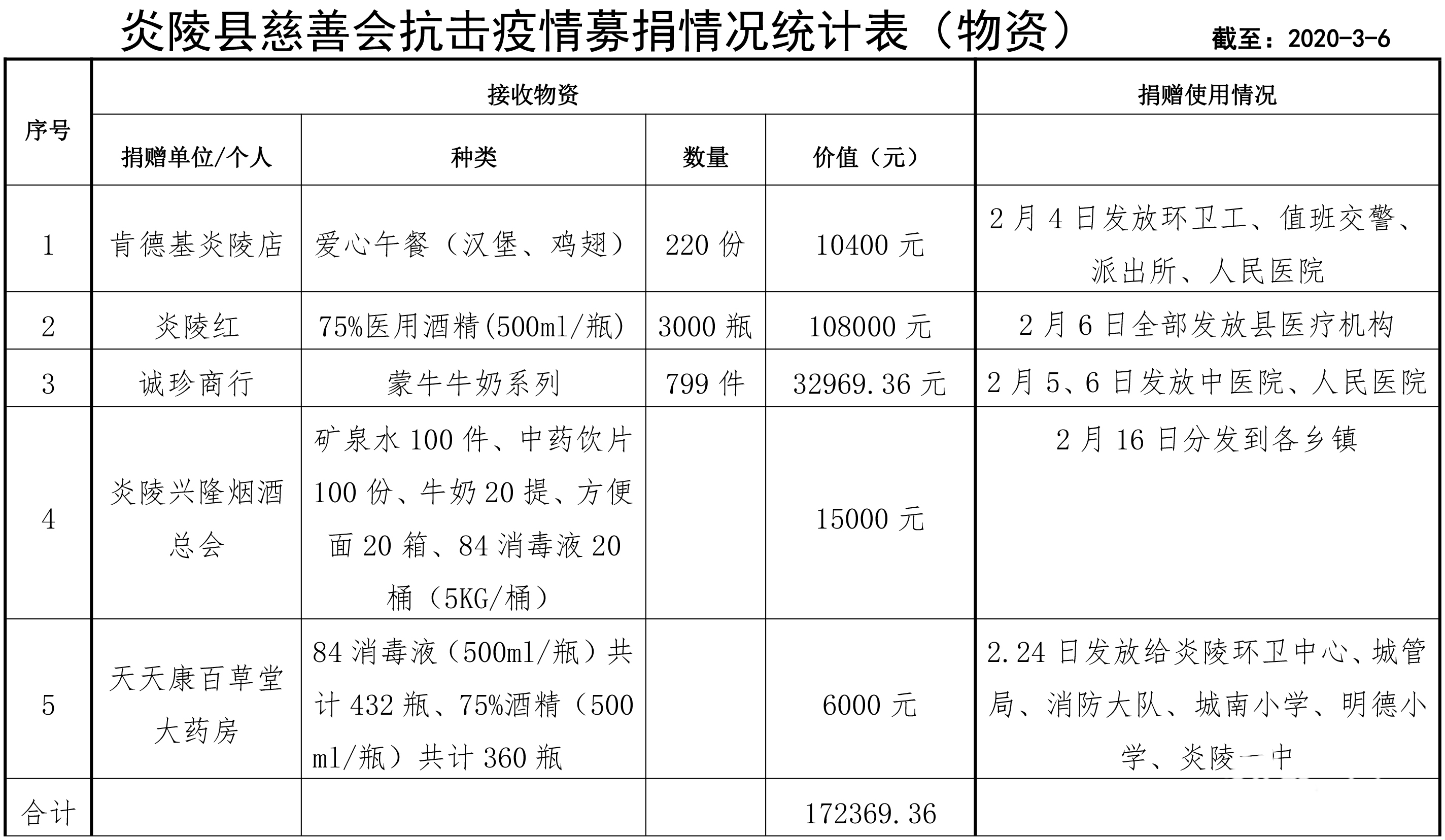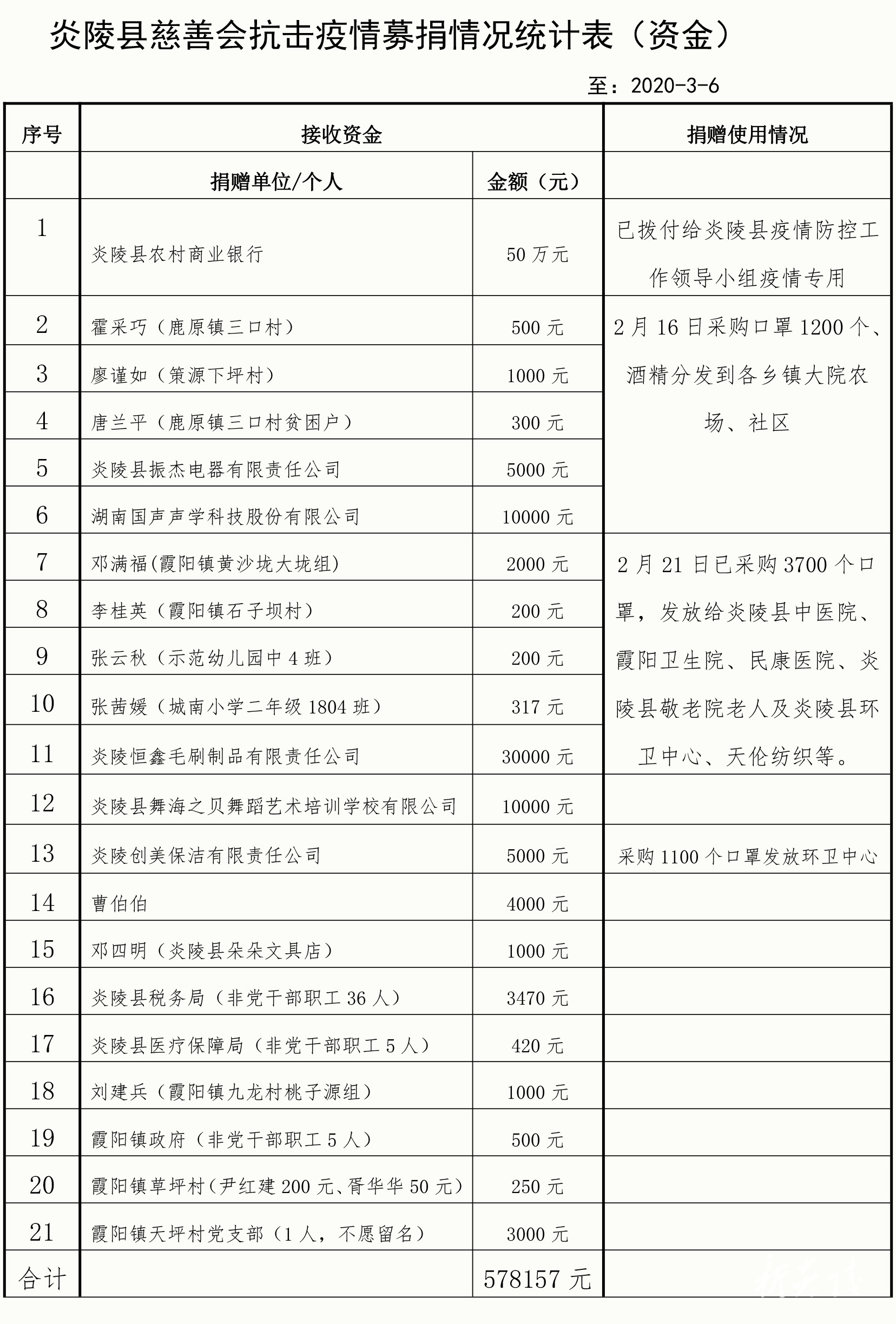 为科学有序做好新型冠状病毒感染的肺炎疫情防控工作,县慈善会于2020年2月1日发起抗击新型冠状病毒感染的肺炎疫情募捐倡议,广泛动员社会慈善力量参与疫情防控捐赠,得到社会各界的积极响应与大力支持。截止3月6日止,累计接受捐赠资金578157.00元,捐赠物资价值172369.36元。根据县疫情防控工作领导小组的统筹安排,现将捐赠情况及使用情况向社会公布如下(见附表):