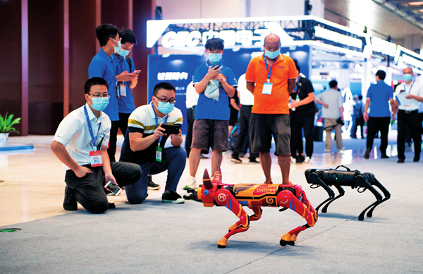 2021年9月17日,观众在长沙举办的2021世界计算大会上观看展出的机器狗、机器牛 陈思汗摄 / 本刊