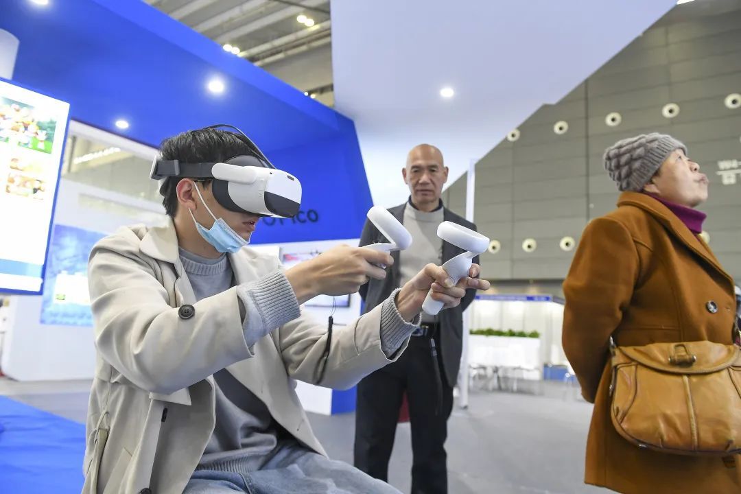 ▲2021(中部)长沙人工智能产业博览会上,市民体验VR游戏设备。来源:湖南日报湘视频道
