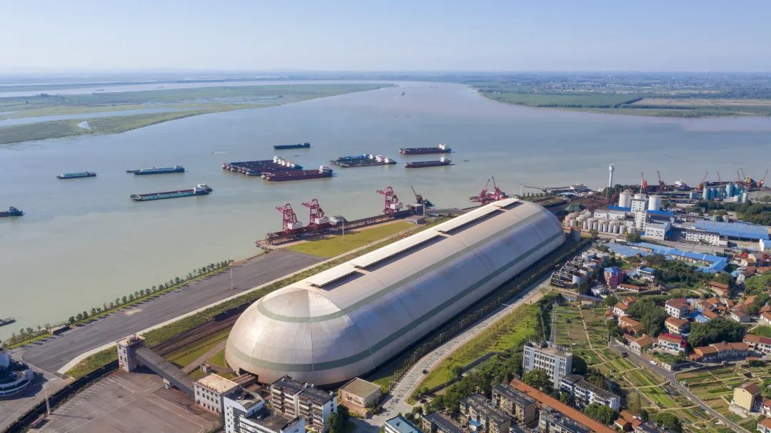 ▲岳阳市城陵矶港环保提质改造项目主体工程——全封闭“胶囊”形散货仓库。 来源:湖南日报湘视频道