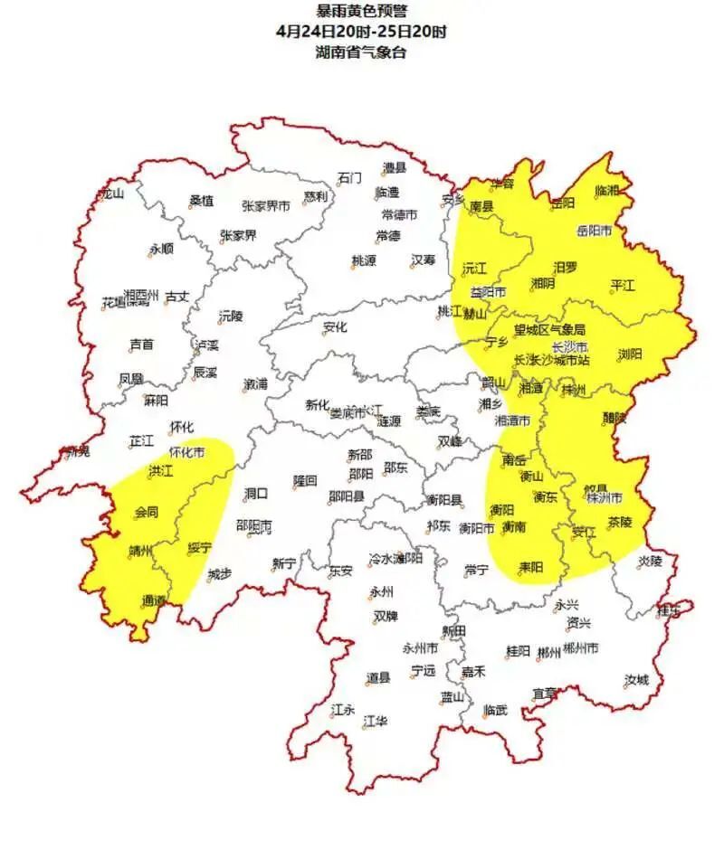 湖南省气象台04月24日16时发布【湖南暴雨黄色预警】:预计24日20时至25日20时,长沙、株洲、湘潭东部、衡阳东部、岳阳、益阳北部、怀化南部部分地区将出现暴雨,局地大暴雨,并伴有短时强降水、雷雨大风等强对流天气,请加强防范。