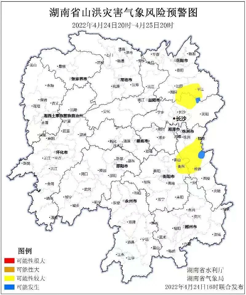 4月24日,湖南省水利厅与湖南省气象局联合发布【湖南省山洪灾害气象风险预警】:自4月24日 20:00至25日 20:00,受降雨影响,岳阳市南部、长沙市北部、株洲市东部等局地可能发生山洪灾害(蓝色预警),岳阳市南部、长沙市北部、株洲市中部、衡阳市东北部等局地发生山洪灾害的可能性较大(黄色预警)。蓝色预警区域:平江县南部、浏阳市西北部、攸县东北部等。黄色预警区域:汨罗市东南部、平江县西南部、浏阳市西北部、长沙县北部、茶陵县西北部、衡南县东北部、衡东县中东部、渌口区南部、醴陵市南部、攸县中西部等。具体预报见附图。