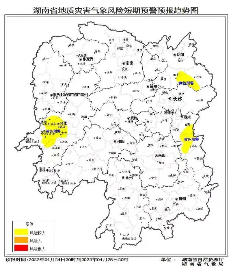 4月24日,湖南省自然资源厅与湖南省气象局联合发布【湖南省地质灾害气象风险预警】:自 4 月 24 日 20:00 至 25 日 20:00,受降雨影响,湘东、湘西部分区域发生突发性地质灾害风险较大(黄色预警)。