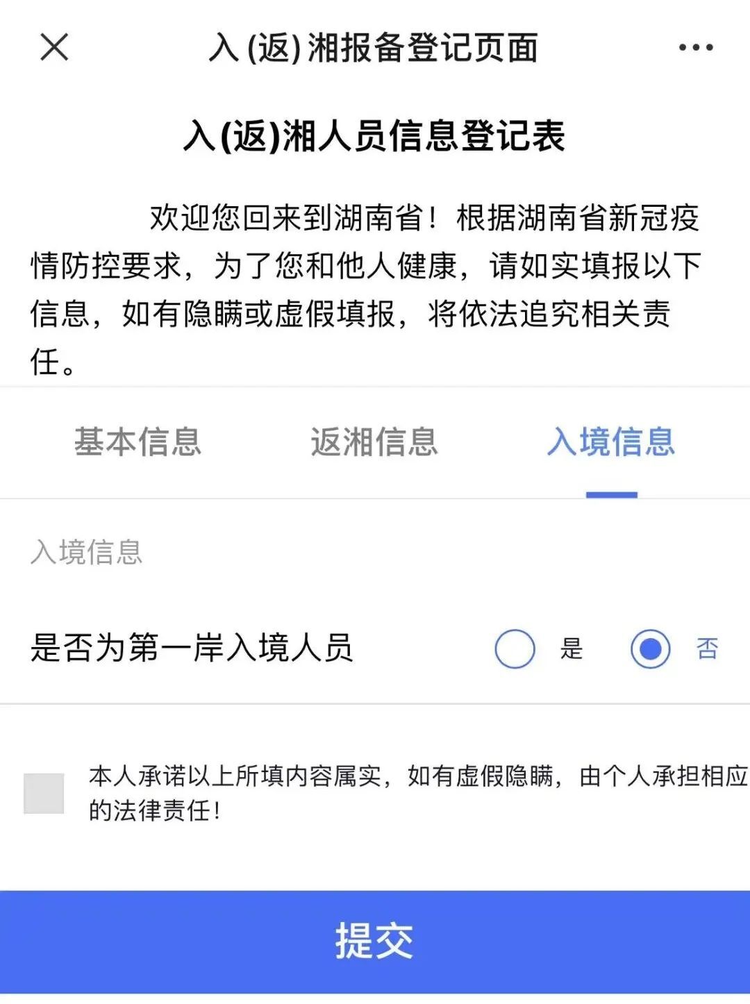 随后进入“入境信息”界面,按要求填写即可,确认无误后,勾选承诺方框,进行提交。