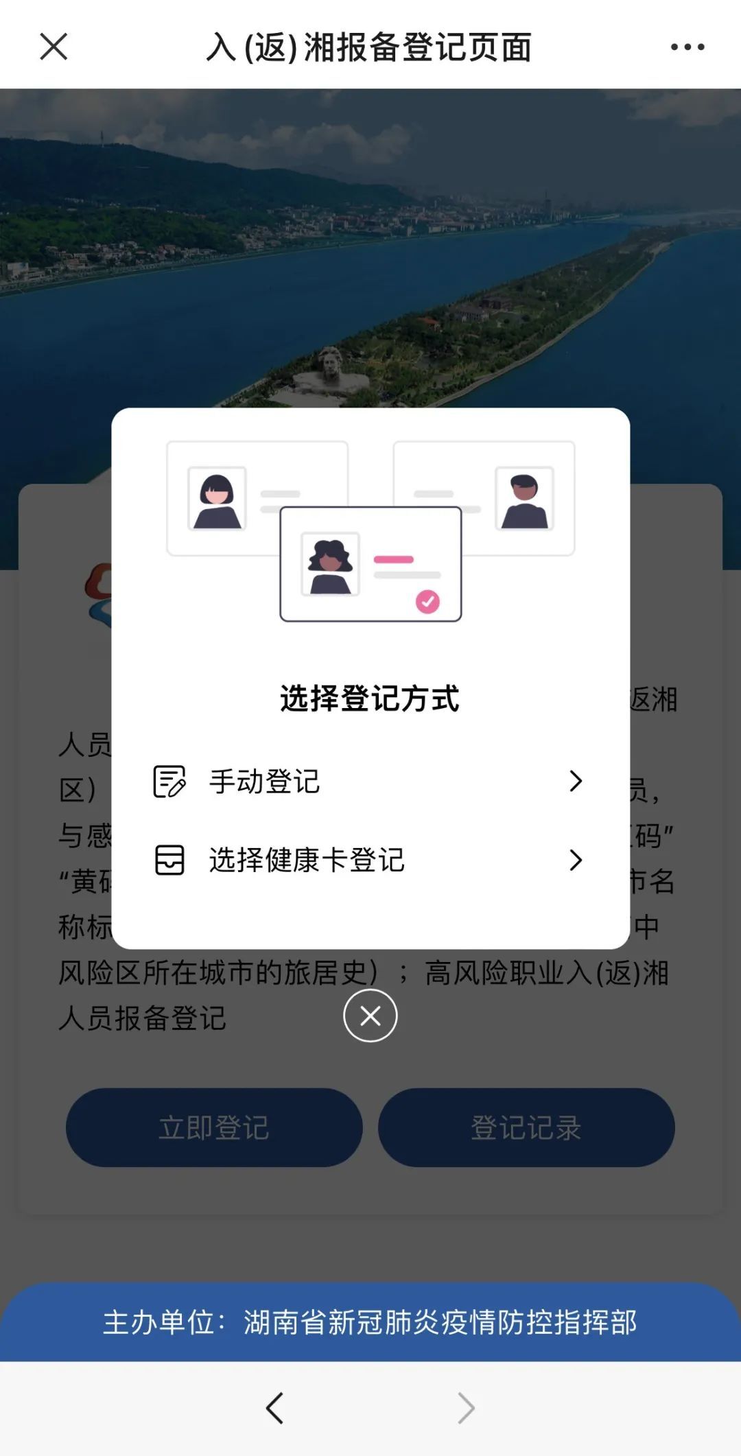 提示两种方式均可进行登录,有“湖南省居民健康卡”的居民点击“选择健康卡登记”;如没有,则选择“手动登记”。