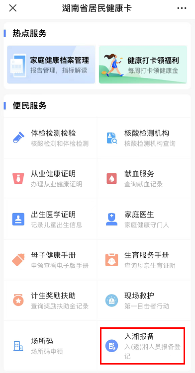 1.在湖南居民健康卡“便民服务”中点击“入湘报备(入<返>湘人员报备登记)”