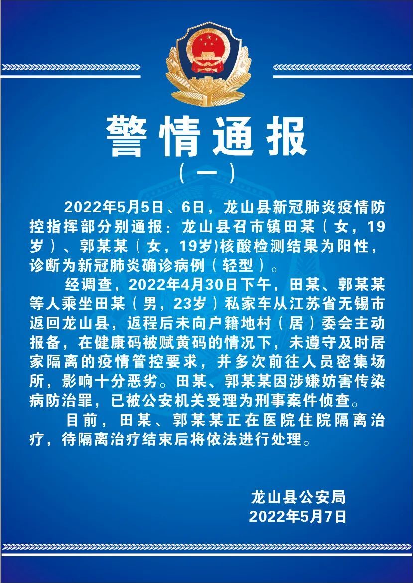 2022年5月5日、6日,龙山县新冠肺炎疫情防控指挥部分别通报:龙山县召市镇田某(女,19岁)、郭某某(女,19岁)核酸检测结果为阳性,诊断为新冠肺炎确诊病例(轻型)。
