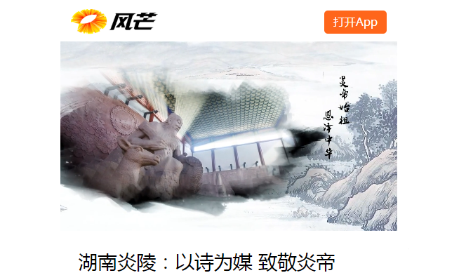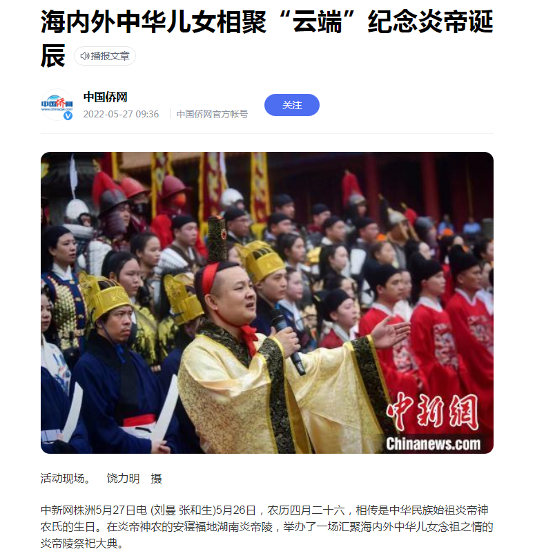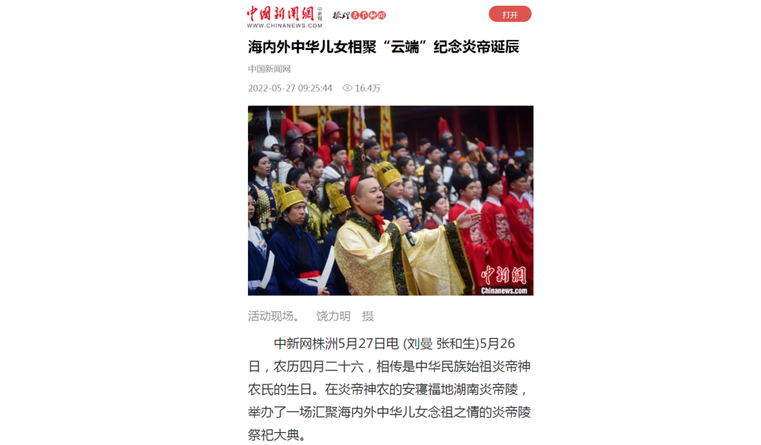 5月26日(农历四月二十六)是炎帝诞辰纪念日,一场以诗为媒,纪念炎帝诞辰的线上朗诵活动在湖南炎陵县举行,人民日报(人民号)、央视频、中国新闻网、中国侨网、华声在线、风芒等新媒体平台对本次活动进行了大力宣推。