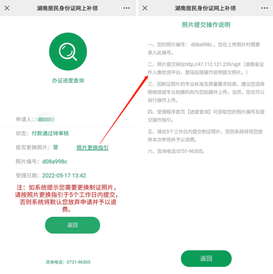 三、符合网上补换领条件的申请人按程序完成缴费后,系统会提示申请人提交近期拍摄且符合制证标准的电子照片(系统未提示上传照片的,将使用历史制证照片)。申请人申领登记完成后,系统将为办证人分配唯一的相片编号,编号可在“进度查询”功能中查看。申请人需要按照相片提交操作说明,登录“湖南省证件人像检测服务平台”,提交符合制证标准的电子照片。(如下图)