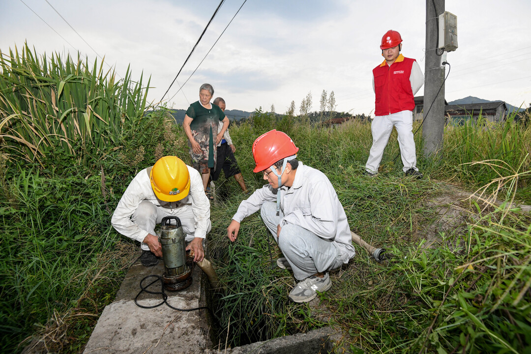 湖南岳阳临湘供电公司忠防供电所员工在10千伏笔沙线沙坪方家台区,为农户免费安装濳水泵进行抗旱抽水。方四义摄