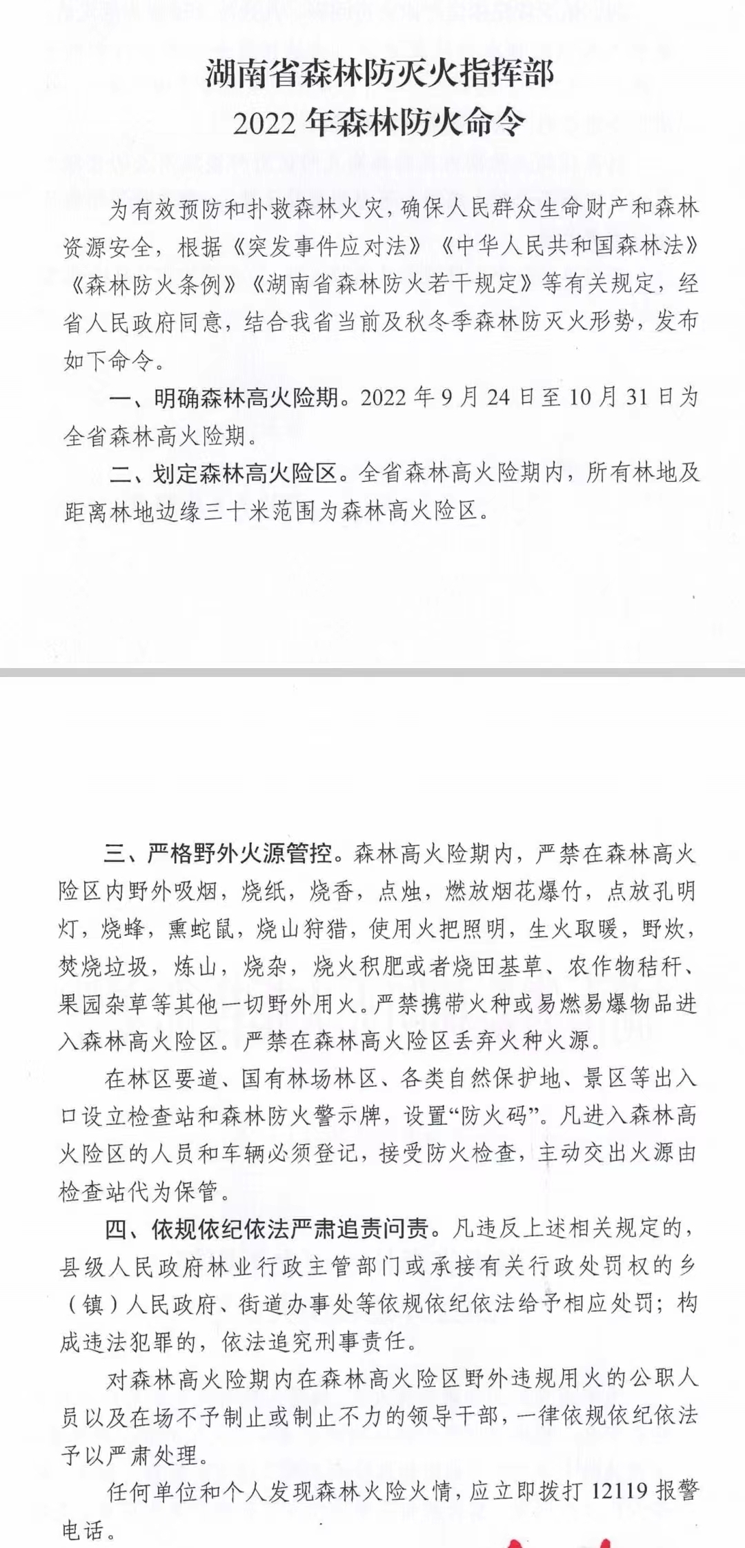 今天,湖南省森林防灭火指挥部(简称“省森防指”)发布2022年森林防火命令,明确森林高火险期、划定森林高火险区,要求严格野外火源管控,依规依纪依法严肃追责问责。