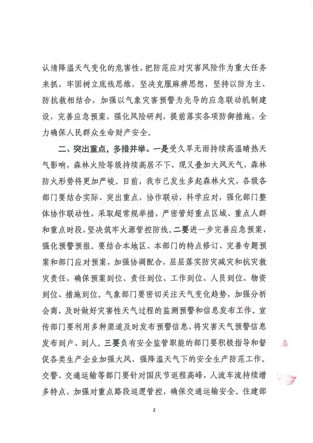 二、突出重点,多措并举。一是受久旱无雨持续高温晴热天 气影响,森林火险等级持续高居不下,现又叠加大风天气,森林 防火形势将更加严峻。目前,我市已发生多起森林火灾,各级各 部门要结合实际、突出重点,协作联动,科学应对,强化部门整 体协作联动性,采取超常规举措,严密管好重点区域、重点人群 和重点时段,坚决筑牢火源管控防线。二要进一步完善应急预案, 强化预警预报。要结合本地区、本部门的特点修订、完善专题预 案和部门应对预案,加强协调配合,层层落实防灾减灾和抗灾救 灾责任,确保预案到位、责任到位、工作到位、人员到位、物资 到位、措施到位。气象部门要密切关注天气变化趋势,加强分析 会商,及时做好灾害性天气过程的监测预警和信息发布工作。宣 传部门要利用多种渠道及时发布预警信息,将灾害天气预警信息 发布到户、到人。 三要负有安全监管职能的部门要积极指导和督 促各类生产企业加强大风、强降温天气下的安全生产防范工作。 交警、交通运输等部门要针对国庆节返程高峰,人流车流持续增 多特点,加强对重点路段巡逻管控,确保交通运输安全。住建部门要做好农村危旧房屋、彩钢板房排查工作,在建施工设施、临时建筑物、室外广告宣传牌、路边树木等进行防风加固,特别是要加固棚架、临时工棚等临时搭建物,必要时暂停室外施工作业。文旅广电部门要播发气象灾害预警信息,指导旅游景区(点)进行隐患排查,采取有效措施确保旅游安全,暂停可能受到灾害影响的文旅活动。电力部门要加强电力设施检查和电网运行监控,及时排查故障、排除危险,修复被损毁的电力设备设施,保障电力供应。