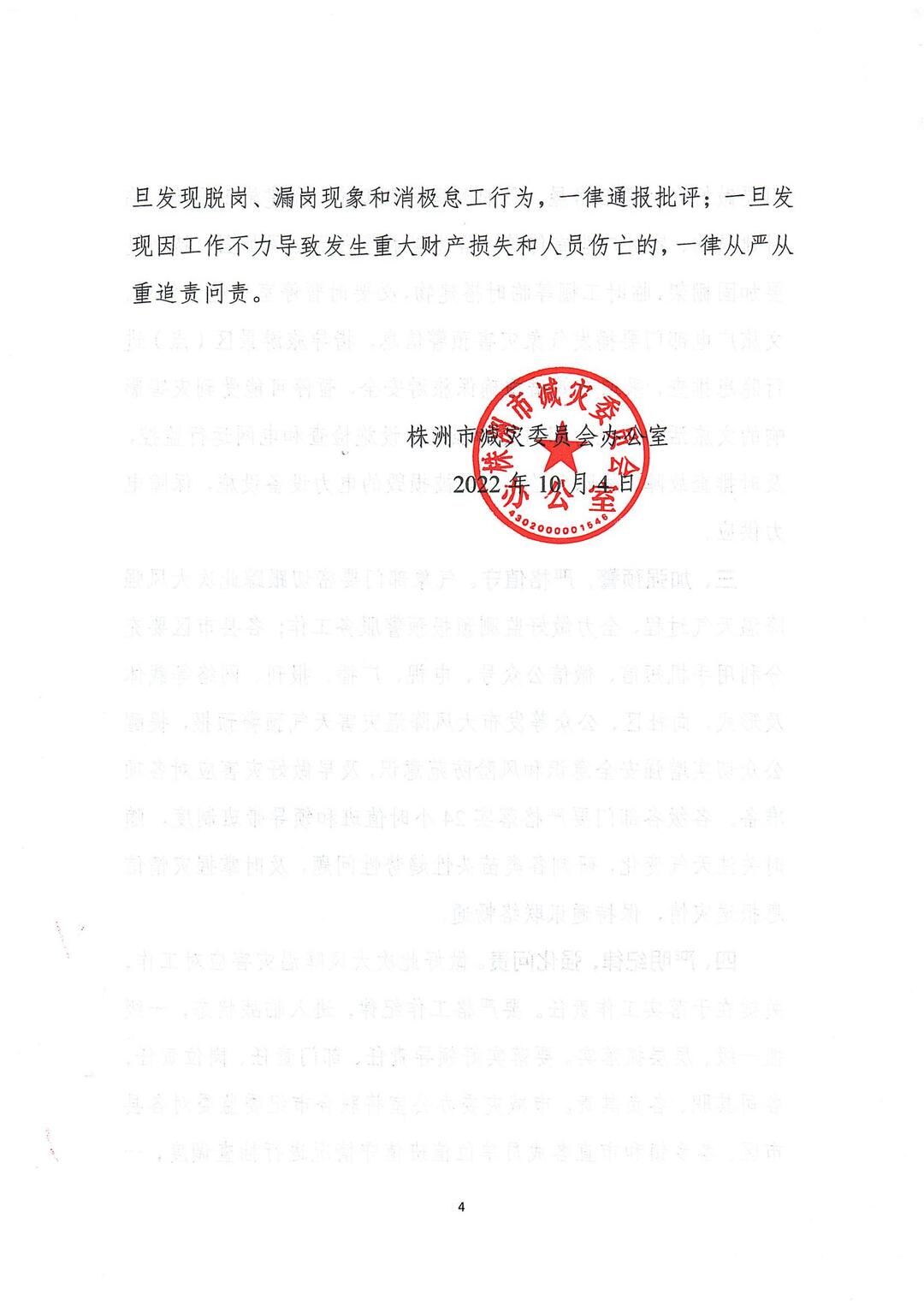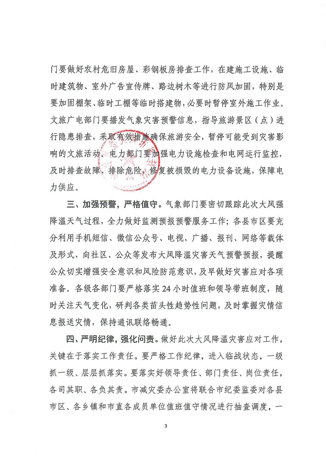 四、严明纪律,强化问责。做好此次大风降温灾害应对工作, 关键在于落实工作责任。要严格工作纪律,进入临战状态,一级 抓一级、层层抓落实。要落实好领导责任、部门责任、岗位责任, 各司其职、各负其责。市减灾委办公室将联合市纪委监委对各县 市区、各乡镇和市直各成员单位值班值守情况进行抽查调度,一旦发现脱岗、漏岗现象和消极怠工行为,一律通报批评;一旦发现因工作不力导致发生重大财产损失和人员伤亡的,一律从严从重追责问责。