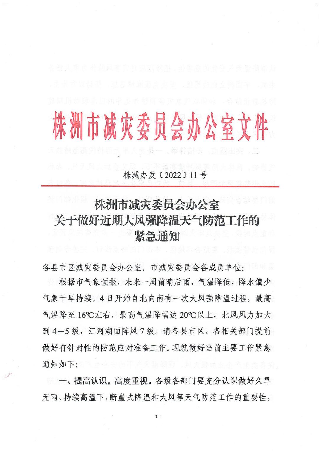 根据市气象预报,未来一周前晴后雨,气温降低,降水偏少 气象干旱持续。4日开始自北向南有一次大风强降温过程,最高 气温降至16℃左右,最高气温降幅达20℃以上,北风风力加大 到4-5 级,江河湖面阵风7 级。请各县市区、各相关部门提前 做好有针对性的防范应对准备工作。现就做好当前主要工作紧急 通知如下: