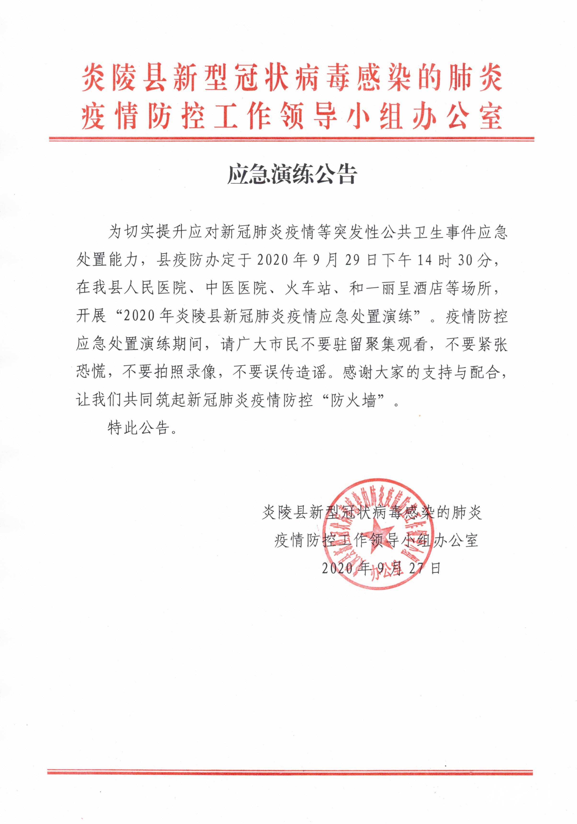为切实提升应对新冠肺炎疫情等突发性公共卫生事件应急处置能力,县疫防办定于2020年9月29日下午14时30分,在我县人民医院、中医医院、火车站、和一丽呈酒店等场所,开展“2020年炎陵县新冠肺炎疫情应急处置演练”。疫情防控应急处置演练期间,请广大市民不要驻留聚集观看,不要紧张恐慌,不要拍照录像,不要误传造谣。感谢大家的支持与配合,让我们共同筑起新冠肺炎疫情防控“防火墙”。