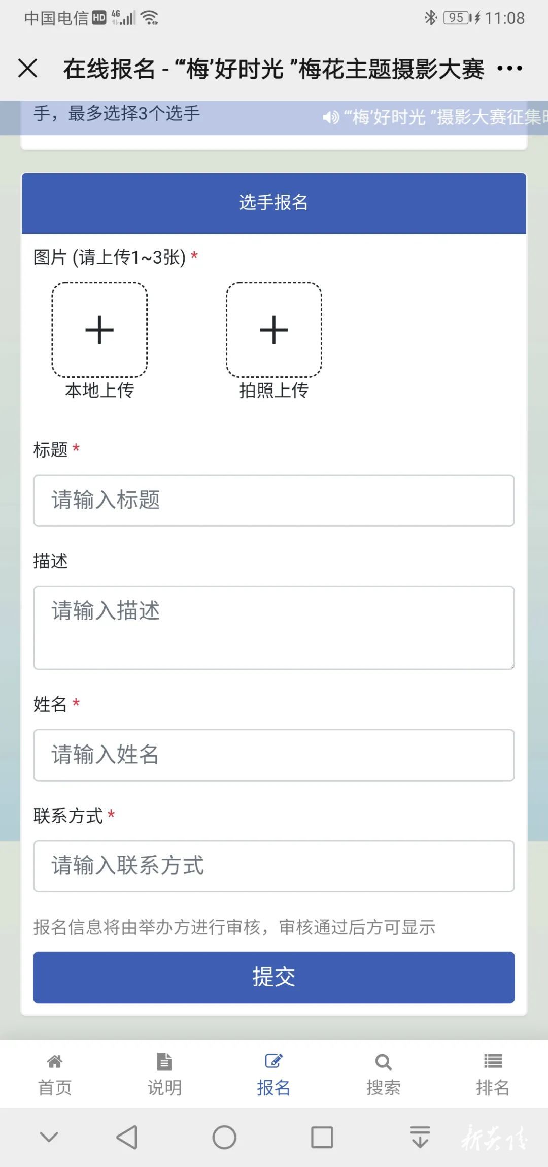 2. 进入参赛通道,点击报名菜单,按要求上传1-3张参赛作品、填写相关信息后,点击提交,等待举办方审核通过;