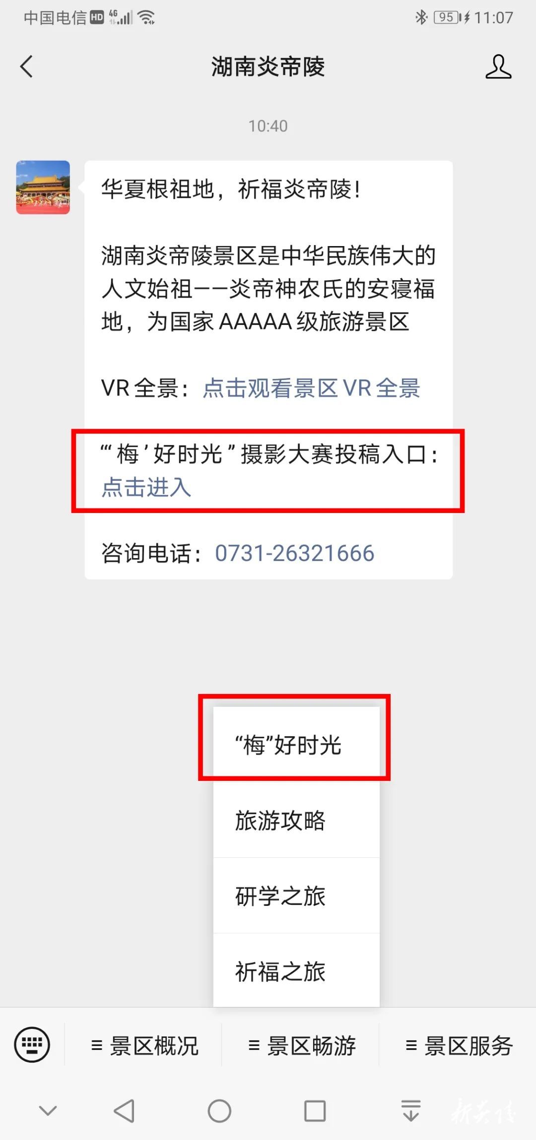 1. 关注景区官方公众号:hnydlwx,进入“‘梅’好时光”摄影大赛征稿入口(下图红框任选一处点击进入);